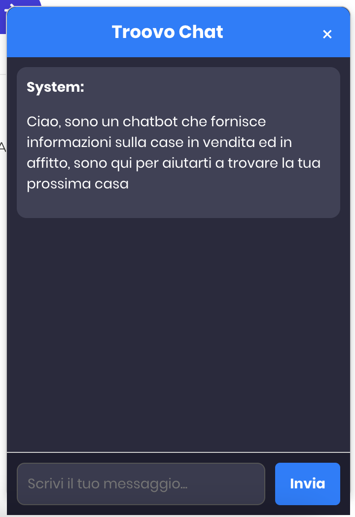 Questo codice collega il chatbot alla piattaforma Troovo e imposta automaticamente i parametri necessari per la comunicazione con il servizio AI.