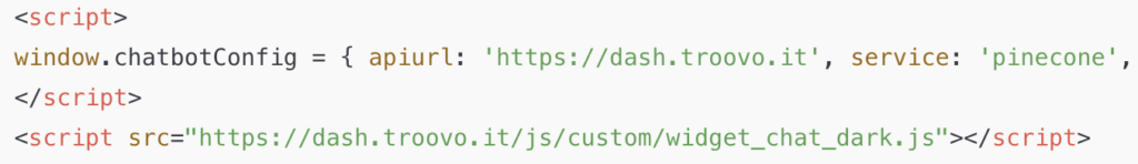 Dalla dashboard di Troovo è possibile generare il codice dello snippet con pochi clic. Una volta ottenuto, il codice deve essere semplicemente incollato all’interno del sito web in cui si vuole integrare il chatbot. Il sistema si attiverà automaticamente, senza necessità di configurazioni aggiuntive.