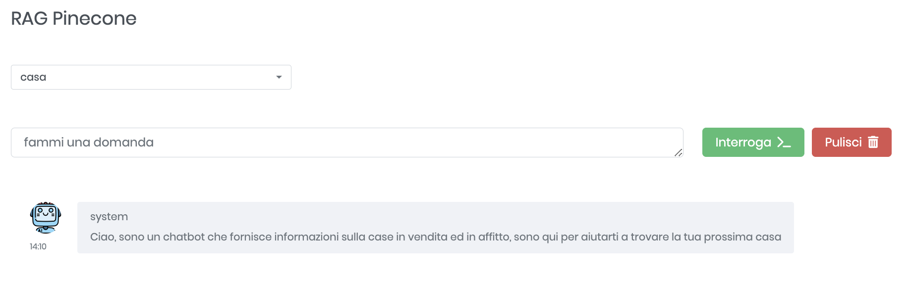 Grazie allo snippet, il chatbot può interagire dinamicamente con gli utenti, fornendo risposte precise e basate su un sistema RAG (Retrieval-Augmented Generation) che collega l’intelligenza artificiale a database vettoriali e documentali.